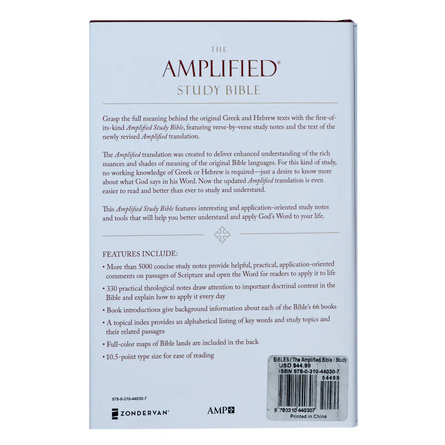 The Amplified Study Bible features verse by verse study notes and the text of the newly revised Amplified translation, using a unique system of punctuation, italics, references, and synonyms to unlock subtle shades of meaning as found in the original languages. This is paired with over 5,000 concise study notes that provide helpful, practical, application-oriented comments on passages of Scripture and open the Word for readers to apply it to life.